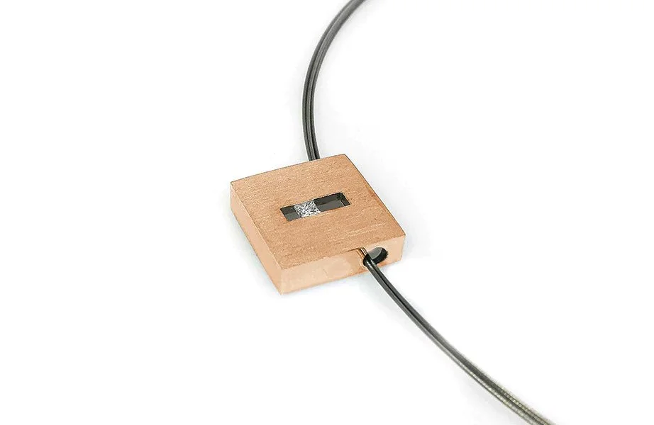 Suspension displays minimalism, boldness and movement. The wearer brings it life as the light captured by movement, flows across its surface. Centered a window, suspended is the sparkle of a diamond engaging the viewer to take a closer look.